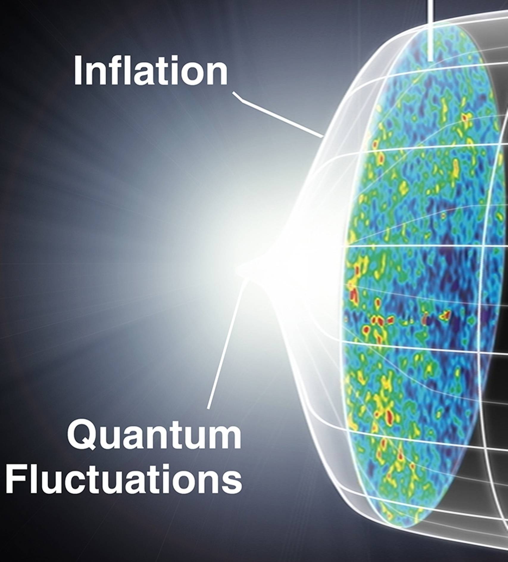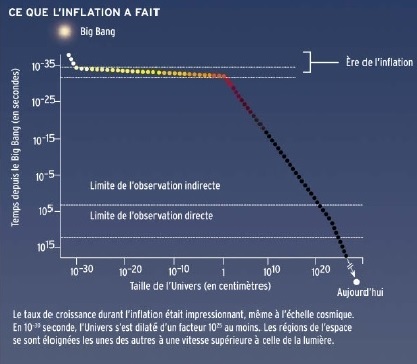 Imaginé par A.Guth en 1979, l’inflation est un processus qui, dès les premiers instants, a permis de dilater les dimensions de l’univers de façon titanesque. Quelques 10-35 s après le « Big-Bang » et alors que la température de l’univers ne cessait de chuter, un champ de Higgs dénommé « inflaton » s’est retrouvé un court instant dans un état d’énergie qu’il n’aurait pas du avoir sans l’aide d’une fluctuation quantique appropriée. Cet état d’énergie qui correspond à ce qu’on appelle le « faux vide » a communiqué à l’univers une énorme poussé l’amenant à se dilater brusquement de façon exponentielle. Puis, une fois l’inflaton ayant repris son état d’énergie minimale qui correspond à ce qu’on appelle alors le « vrai vide », l’énergie du champ a servi à engendrer des particules. Une analogie souvent