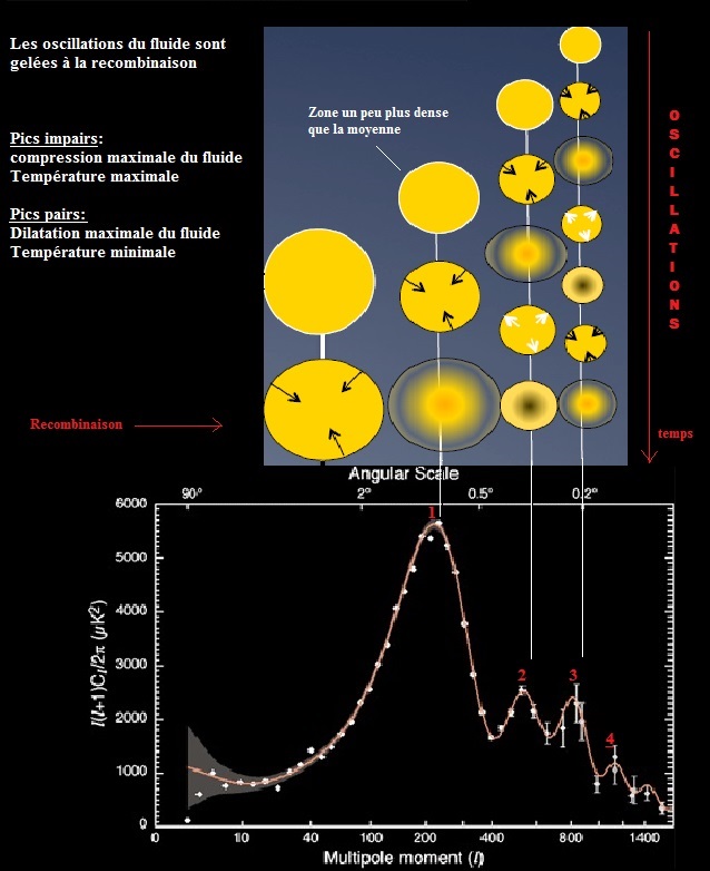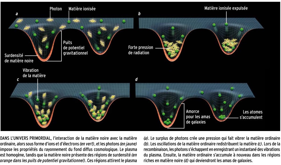 En raison de ces fluctuations primordiales, des zones de surdensités vont apparaître dans le plasma originel formé juste après la nucléosynthèse c'est à dire quelques minutes après le big-bang. Ce plasma est principalement constitué de matière noire, de neutrinos mais aussi de photons, d'électrons et de baryons (essentiellement protons et noyaux d'hélium). Une fois l'égalité matière-rayonnement dépassée (t ~100 000 ans) l'expansion est surtout gouvernée par la matière et les zones de surdensités de matière vont s'effondrer sous l'action de la gravité. La température dans les zones surdenses augmente, conduisant alors à l'augmentation de la pression de radiation. A cette époque, les baryons sont fortement couplés aux photons via les électrons (par diffusion compton puis thomson), et la forte pression de radiation va dès lors contribuer à diminuer l'amplitude des zones de surdensités dans lesquelles les baryons avaient plongé, entrainant à son tour une diminution de la pression de radiation. La gravité l'emporte à nouveau et entraine un nouvel effondrement et ainsi de suite. Photons et baryons connaissent donc une phase d'oscillation de densité appelée "oscillations baryoniques acoustiques". Il apparait ainsi des ondes de surdensité se propageant dans le plasma baryons-électrons-photons et dont la vitesse de propagation est notée "Cs".