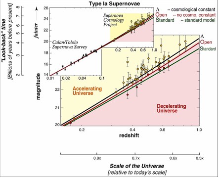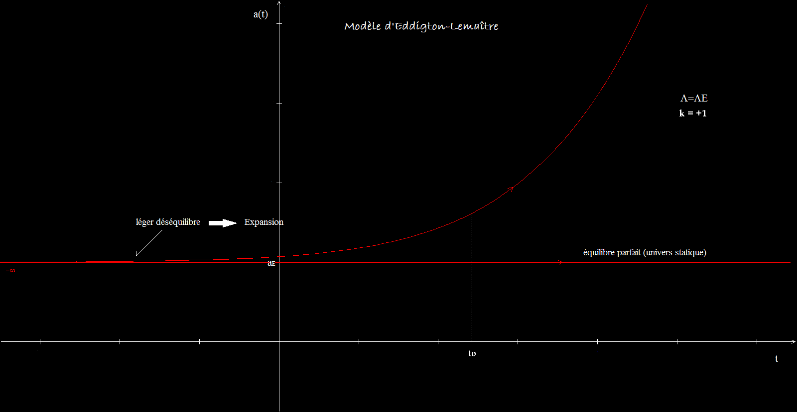 Etonnament, lorsqu'Einstein posa les équations décrivant un tel univers statique, elles indiquaient au contraire un univers soit en expansion soit en contraction ! Le seul moyen de le rendre immobile pour imiter l'apparence de la voie lactée était d'ajouter un terme supplémentaire aux équations de la RG: la fameuse constante cosmologique ![]()