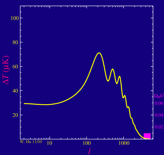 Il est à noté que la position du premier pic dépend avant tout de la densité baryonique car celle-ci fixe la vitesse de l'onde acoustique . Une forte densité baryonique donne une vitesse du son plus faible et donc une longueur d'onde fondamentale plus importante. Le premier pic (ainsi que les autres) seront donc légèrement déplacés vers la droite ie à un multipole plus élevé. La position du premier pic teste donc avant tout les prédictions de la nucléosynthèse. Une fois la densité baryonique estimée (via la hauteur relative des différents pics), on peut dès lors évaluer la courbure de l'univers dont l'influence sur la position du premier pic acoustique est importante.