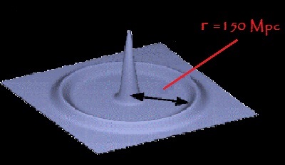 Ces zones de surdensité de matière ( r = 0 et r = rs) vont devenir les lieux privilégiés de formation des futurs galaxies et de leur accumulation sous forme d'amas. Ainsi, si on considère un grand nombre de galaxies et que l'on mesure la distance entre 2 paires, il devrait apparaître un excès de ces paires pour une valeur de distance proportionnelle à rs au facteur d'échelle a(t) près, comme on le verra plus tard.
