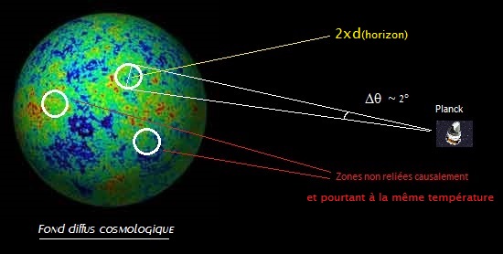 Lorsque le rayonnement cosmologique a été émis 380 000 ans après le big-bang, seules les parties de l'univers séparées de 380 000 a.l (si on ne tient pas compte du phénomène d'expansion) pouvaient être reliées causalement ce qui signifie que le processus d'homogénéisation n'a pu se faire que sur des distances de 380 000 al au mieux. Le problème est que l'univers possède à cette période une taille déjà bien supérieure si bien que le fond diffus cosmologique n'a aucune raison d'être totalement homogène et isotrope comme le prouvent les différentes observations. La solution du problème est que toutes les régions de l'univers à cette époque étaient déjà en "contact" avant d'être écartelées par l'inflation. Ainsi, l'univers que nous observons est très uniforme aujourd'hui car il est le résultat de la dilatation extrême d'un germe minuscule dans lequel l'énergie avait déjà eu le temps d'être distribuée de façon uniforme.
