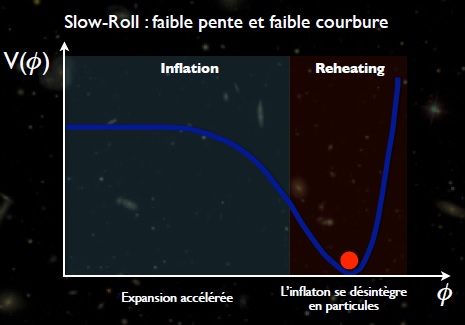 Cette équation est la même que pour une balle roulant sur le potentiel avec un terme de friction. Un tel mouvement présente 2 régimes différents: un premier où la friction domine et la balle descend lentement le potentiel et un deuxième où celle-ci fait de rapides oscillations autour du minimum pour finir par s'y stabiliser. C'est lors de ses oscillations amorties que l'énergie restante de l'inflaton sert à engendrer matière et rayonnement via des couplages appropriés avec les différents champs de matière. S'en suit enfin une période de thermalisation des particules ainsi produites: L'univers est dès lors en équilibre thermique comme le prouve le FDC. Néanmoins aucune théorie ne permet de passer simplement d'un potentiel de type "slow roll" à un potentiel caractéristique de la phase de réchauffement.