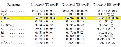 La valeur déduite des observations menées par le satelitte Planck donne 0,01041 rad. (tableau ci contre)